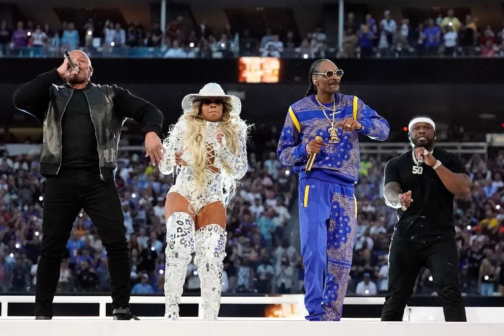 Snoop Dogg’s blue and gold outfit brought to mind, yet again, the importance of place, since those are the LA colors. That it was a bandana tracksuit also highlighted two trends that have long had a place in black sartorial history. Mary J. Blige’s outfit was patterned to look like a snow leopard, thereby referencing jazz bandleader Cab Calloway’s dramatic style (Vogue); but like Snoop Dogg’s bandana print, leopard print also has a long sartorial history viewers could immediately connect to. Moreover, the leopard spots looked like the squares on disco balls, thus referencing yet another predominantly black musical genre– a genre that, in fact, gave birth to rap and hip hop.